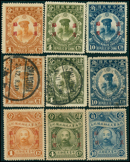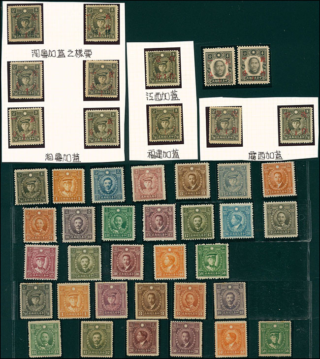 民國票1批:國父先烈像改作1分全套,含湘粵加蓋2枚樣張,烈士像北平版全套,烈士像港版有水印全套