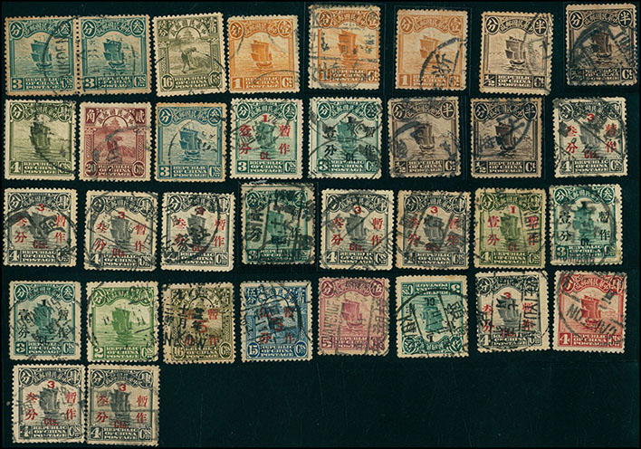 帆船,穀穫,宮門舊票,戳,殘片約100件,包括暫作改值票,詳圖