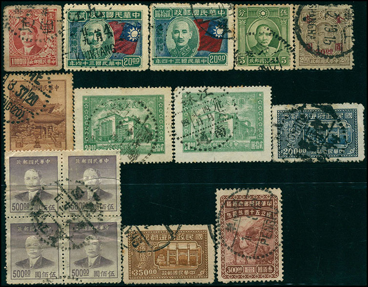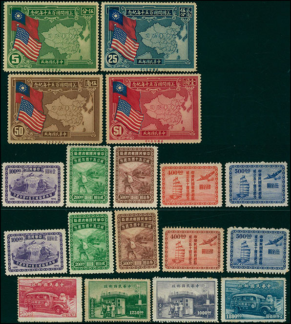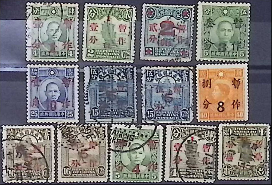 郵政40年及抗戰前紀念票等,共12枚,新舊皆有,分貼於回流進口紙貼票紙上