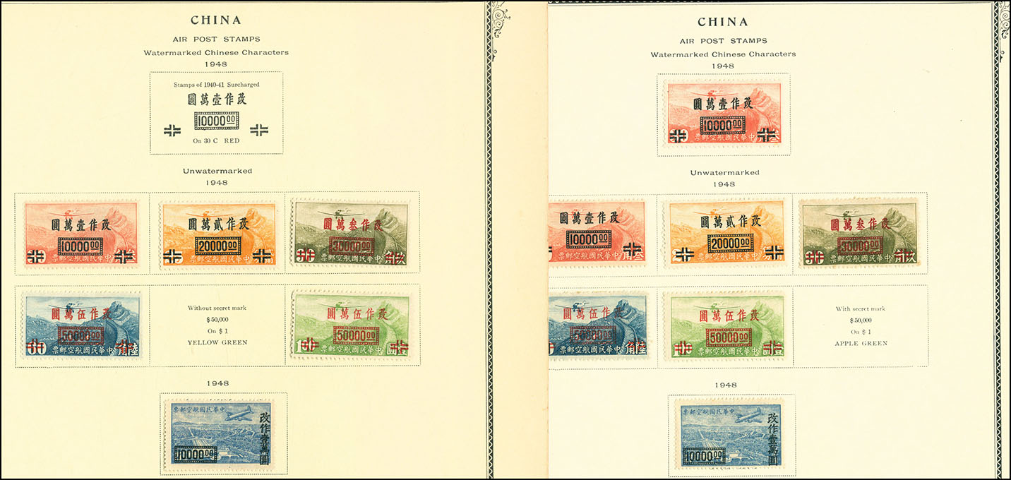 由國外回流之定位冊中取下5頁,上以膠水紙浮貼香港及北京版長城圖航空加蓋改值票(航5~7)等