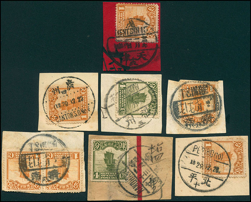帆船票剪片7件(1件為雙連),均銷不同地名之全戳