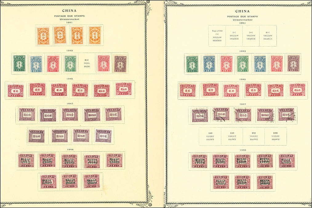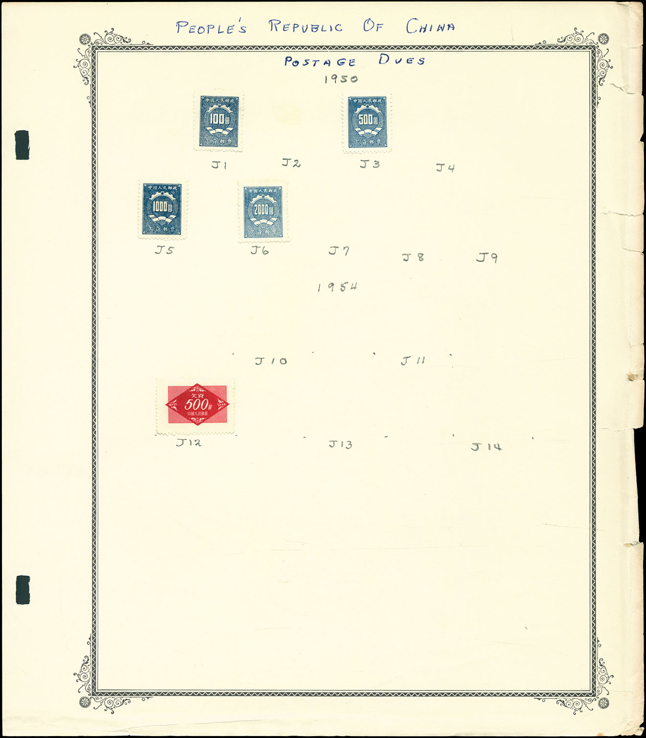 由國外回流之定位冊中取下5頁,上以膠水紙浮貼民國藍欠資起至中共紅欠資約85枚(種)
